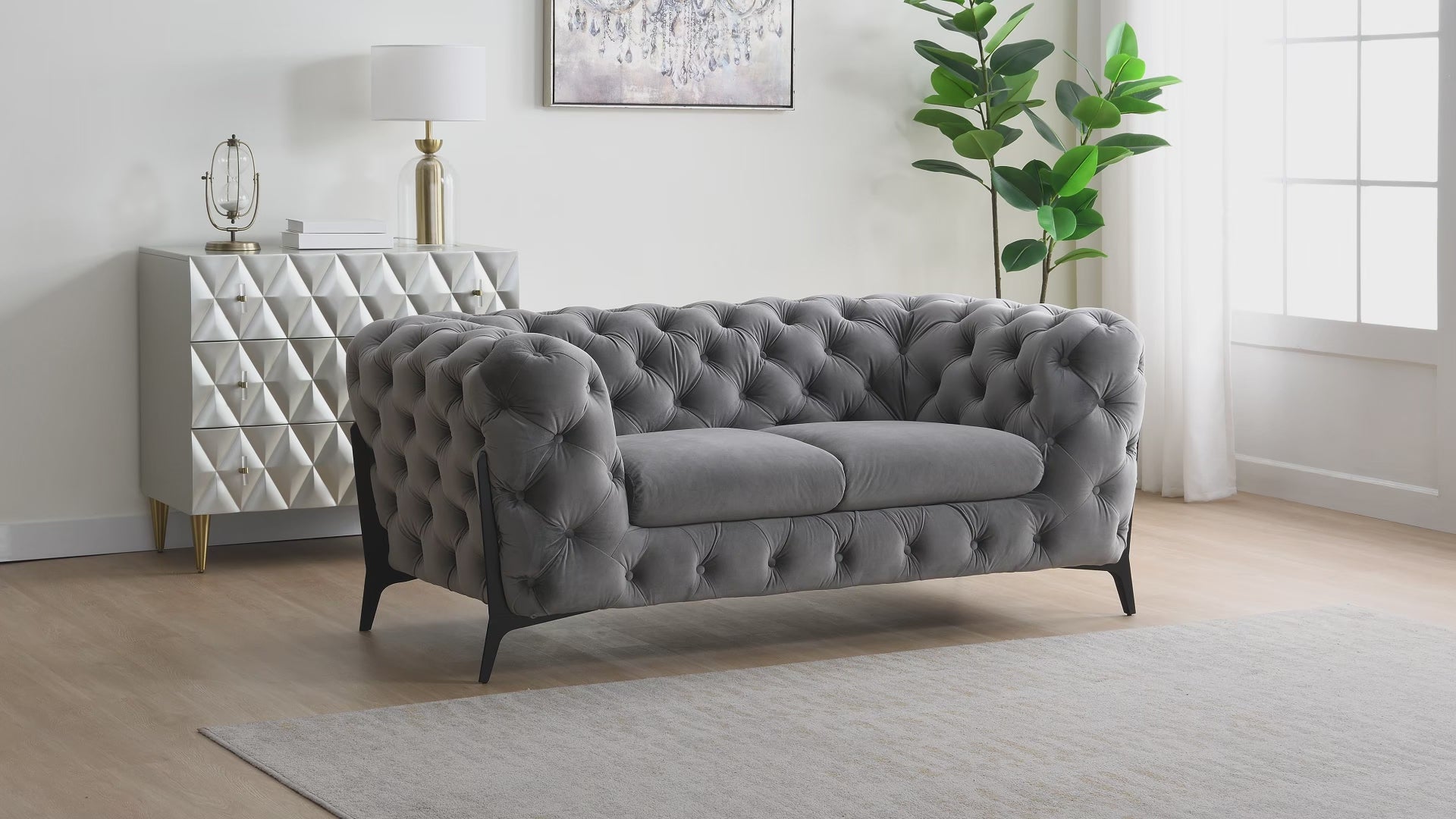 Canapé 2 places capitonné chesterfield velours gris CARMEN
