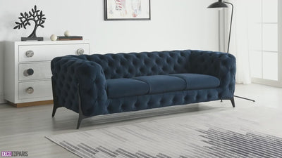 Découvrez l’alliage parfait du style mythique et indémodable du chersterfield avec la modernité du métal noir du canapé 3 places capitonnés en velours CARMEN.