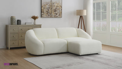 Son revêtement en tissu bouclette blanc, doux et résistant, offre un toucher agréable et une apparence chaleureuse. Avec ses lignes arrondies et son design contemporain, il s’intègre facilement dans différents styles d’intérieur, du moderne au scandinave.