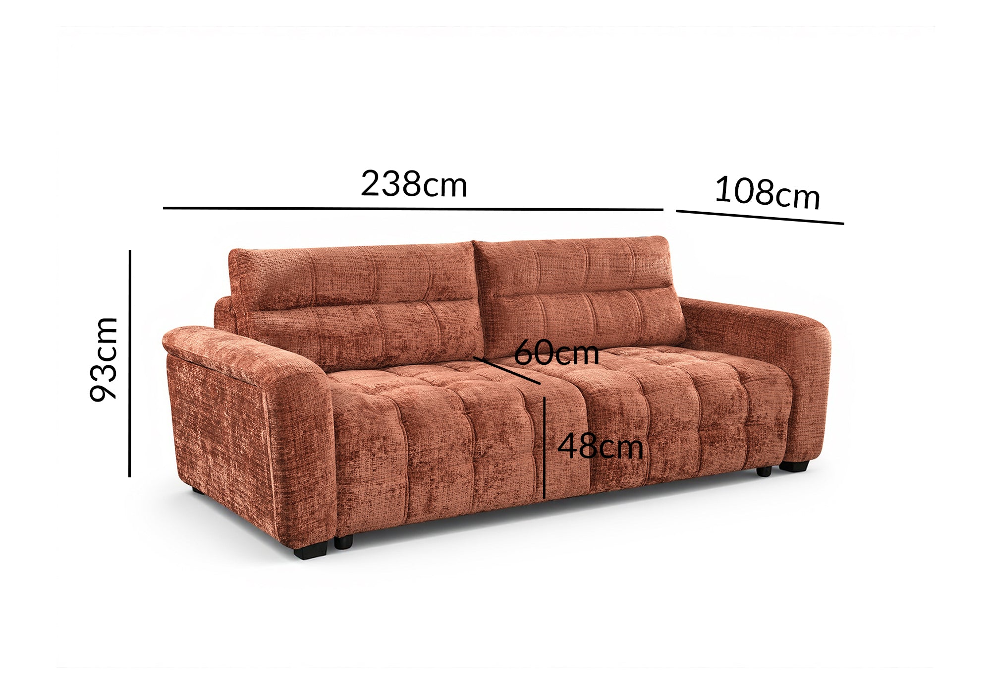 Le canapé RALYA en velours terracotta associe confort, élégance et fonctionnalité dans un format généreux. Conçu pour 3 places, il offre une assise spacieuse au quotidien et se transforme facilement en couchage grâce à son système convertible, idéal pour recevoir famille ou amis.
