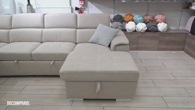 Découvrez notre somptueux canapé convertible et panoramique avec coffre de rangement en tissu beige OLIVER - Angles droit !