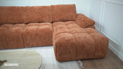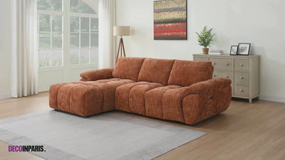 Le canapé d’angle relax électrique en velours chiné terracotta ALPES allie avec élégance confort et design contemporain. Grâce à son assise généreuse, ses formes arrondies et son revêtement en velours chiné texturé, il apporte une touche chaleureuse, moderne et raffinée à votre salon.