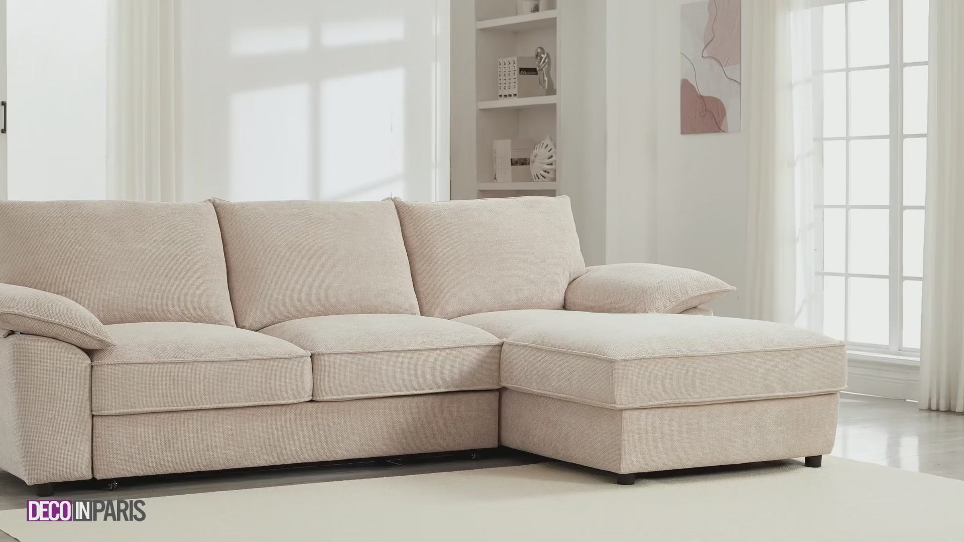 Apportez une touche de modernité à votre salon avec ce canapé d'angle convertible avec coffre de rangement en velours chiné beige GABIN - angle droit.