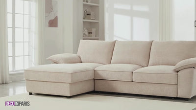 Apportez une touche de modernité à votre salon avec ce canapé d'angle convertible avec coffre de rangement en velours chiné beige GABIN - angle gauche.