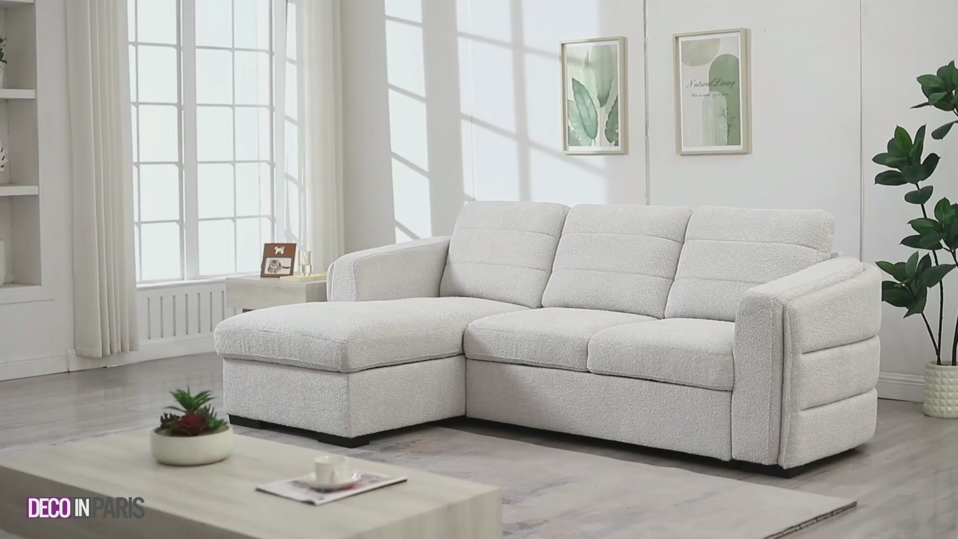 Le canapé convertible CALANDRA en tissu bouclette gris clair est la solution idéale pour ceux qui recherchent un mobilier alliant style, confort et praticité. Ajoutez-y quelques coussins ou un plaid pour un effet cosy et personnalisé !