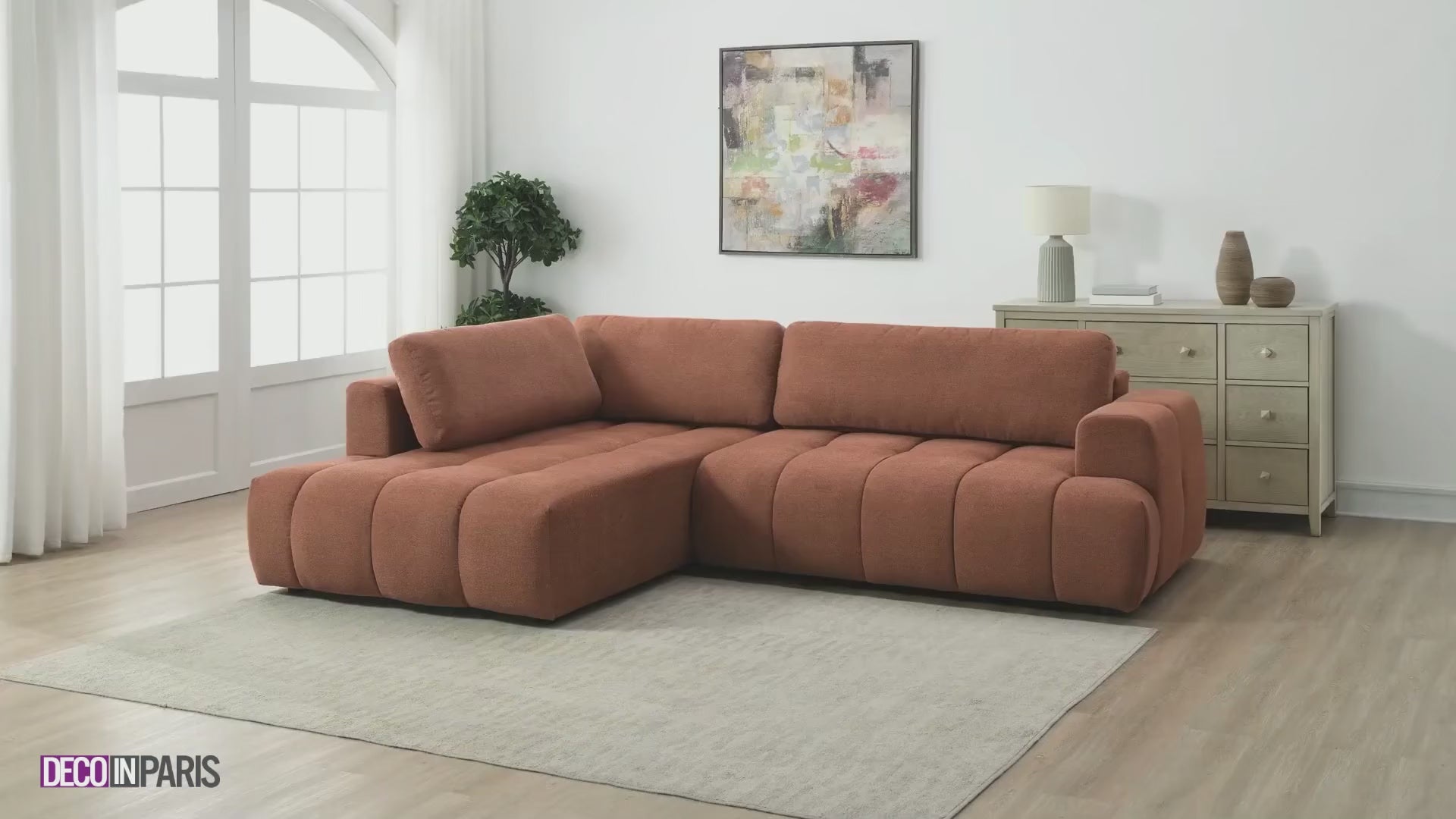 Le canapé d'angle convertible avec coffre de rangement en tissu terracotta HAVEN apportera une touche de confort et d’élégance à votre salon grâce à son design épuré et ses assises larges et moelleuses, offrant une expérience de détente unique tout en sublimant votre intérieur.
