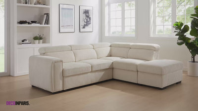 Offrez élégance et praticité à votre salon avec le canapé d'angle droit convertible 5 places en velours côtelé épais beige avec pouf coffre ZENOVA.