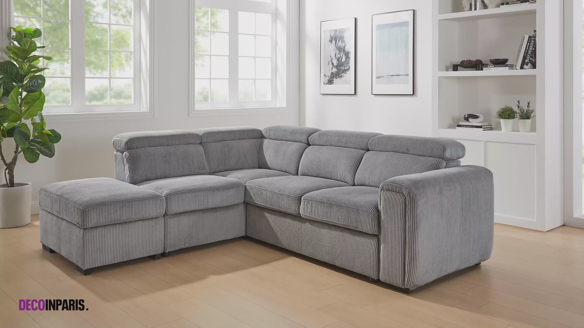 Offrez élégance et praticité à votre salon avec le canapé d'angle gauche convertible 5 places en velours côtelé épais gris avec pouf coffre ZENOVA.