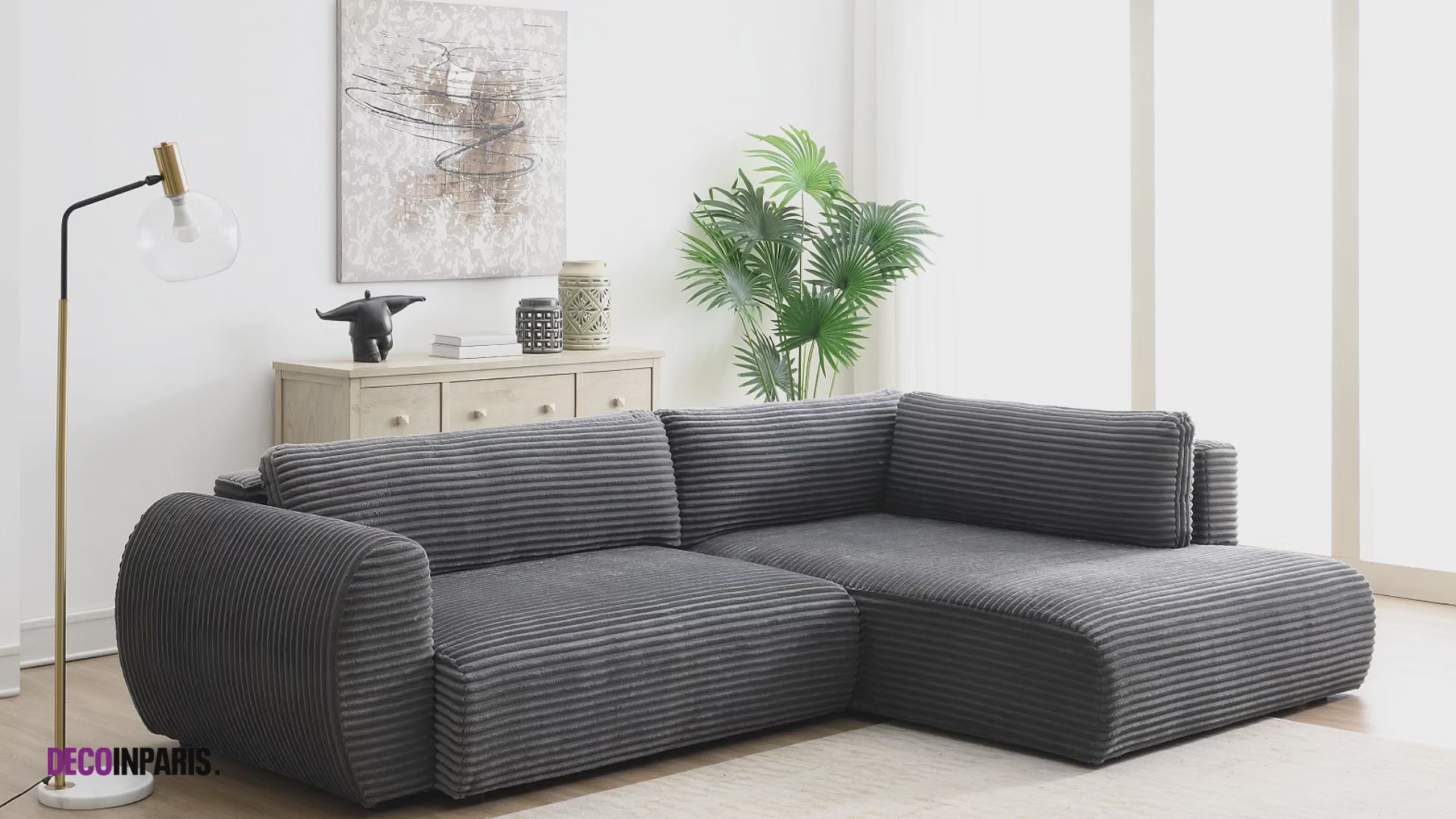 Canapé d'angle convertible avec méridienne et coffre en gros côtelé gris TILDA - Angle droit