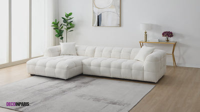 Notre canapé d'angle droit effet peau de mouton blanc écru BELLA deviendra la pièce maîtresse de votre salon. Son design moderne et épuré apportera une touche d'élégance à votre décoration intérieure. Avec ses courbes bombées et ses finitions soignées, ce canapé 3 places s'intègrera parfaitement à tous les styles d'intérieur en passant du plus classique au plus moderne.