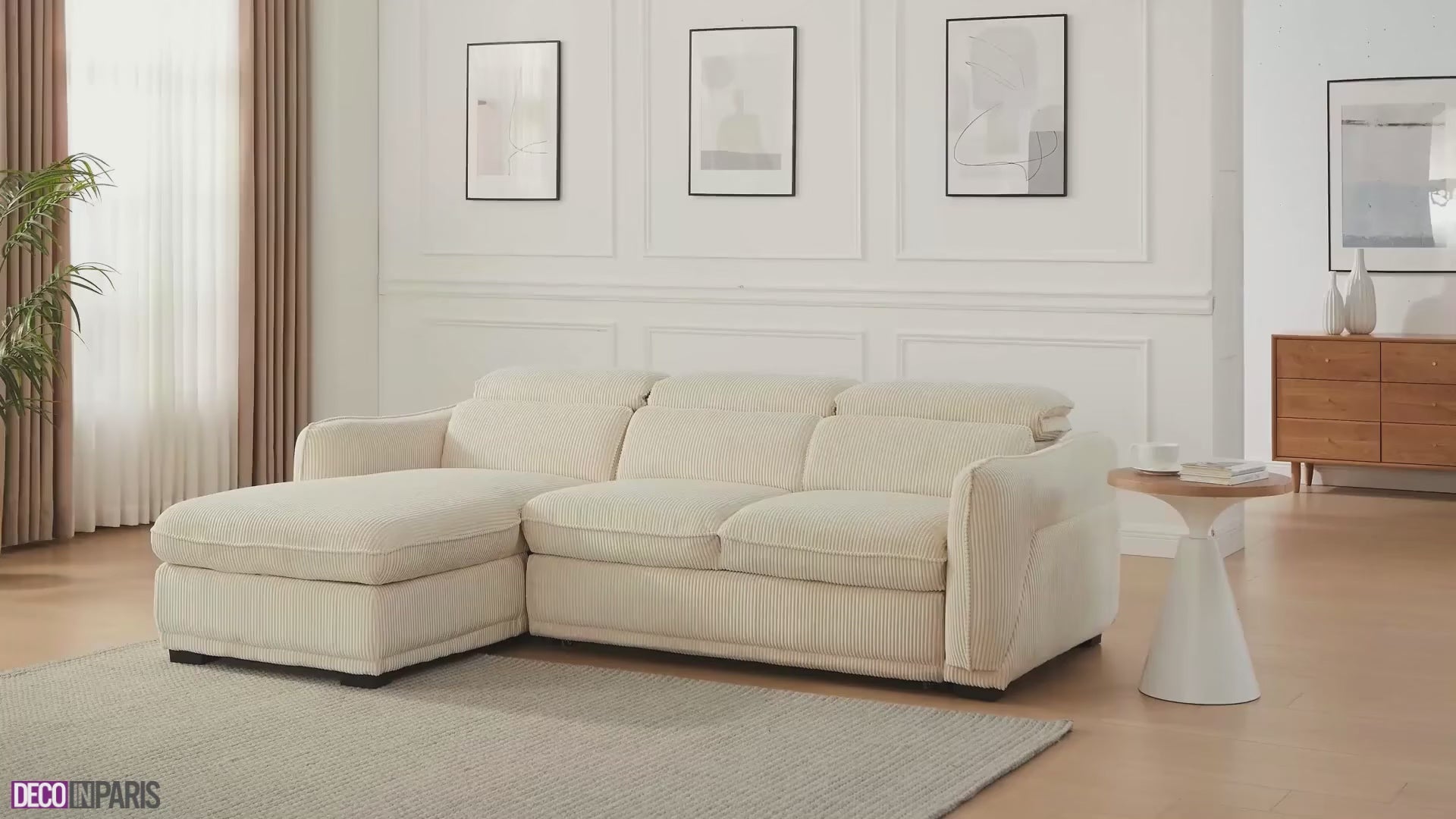 Craquez pour le canapé d'angle gauche convertible en velours côtelé épais beige PETUNIA, une alliance parfaite entre élégance et praticité qui apportera du charme et du confort à votre salon.