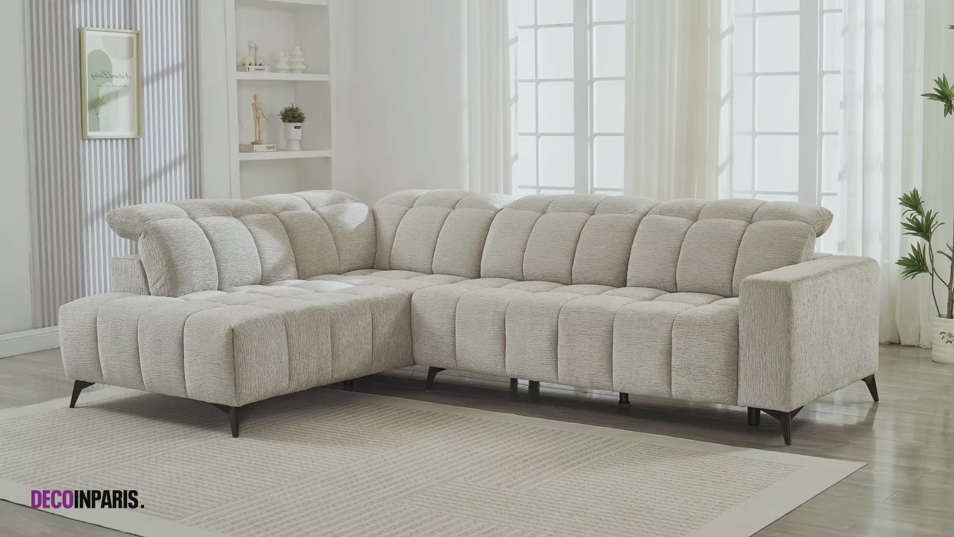 Pensé pour allier design contemporain et bien-être au quotidien, le canapé d’angle ALVAR en velours chiné beige transforme votre salon en véritable havre de confort.