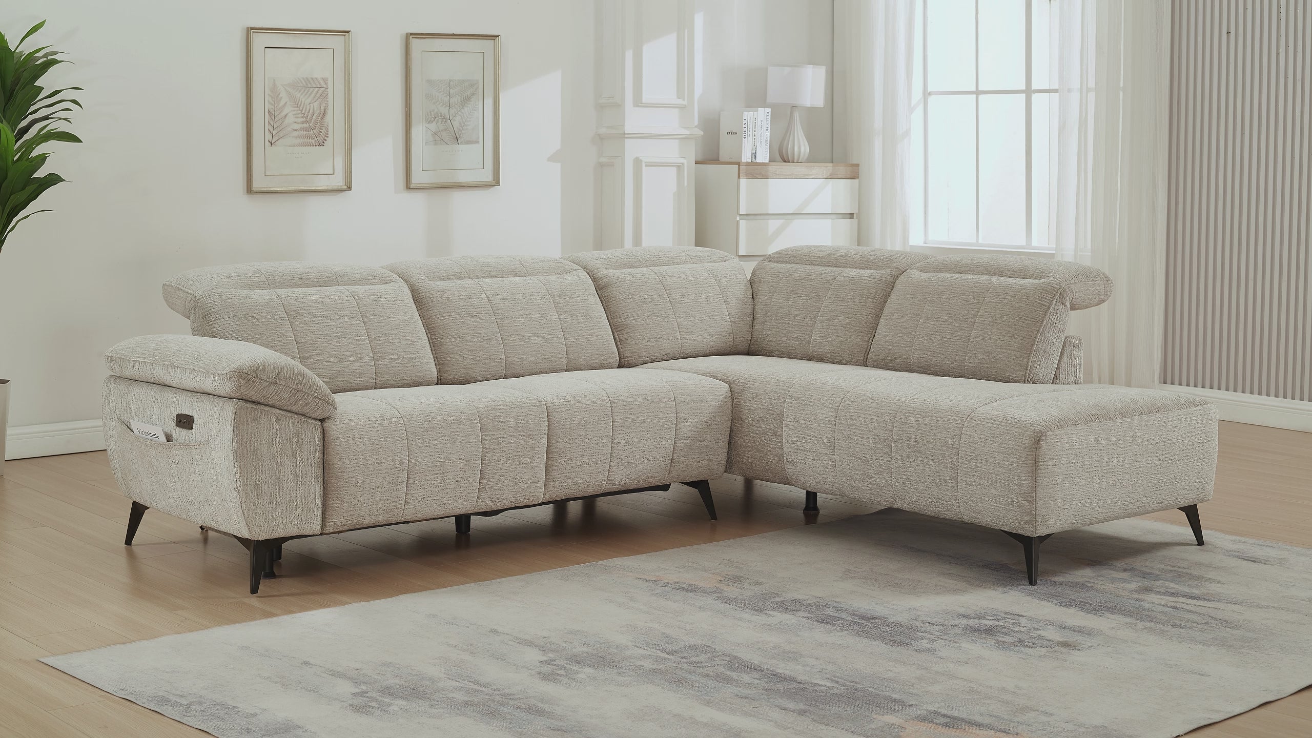 Canapé d'angle relax électrique en velours chiné beige SOLINA - Angle droit