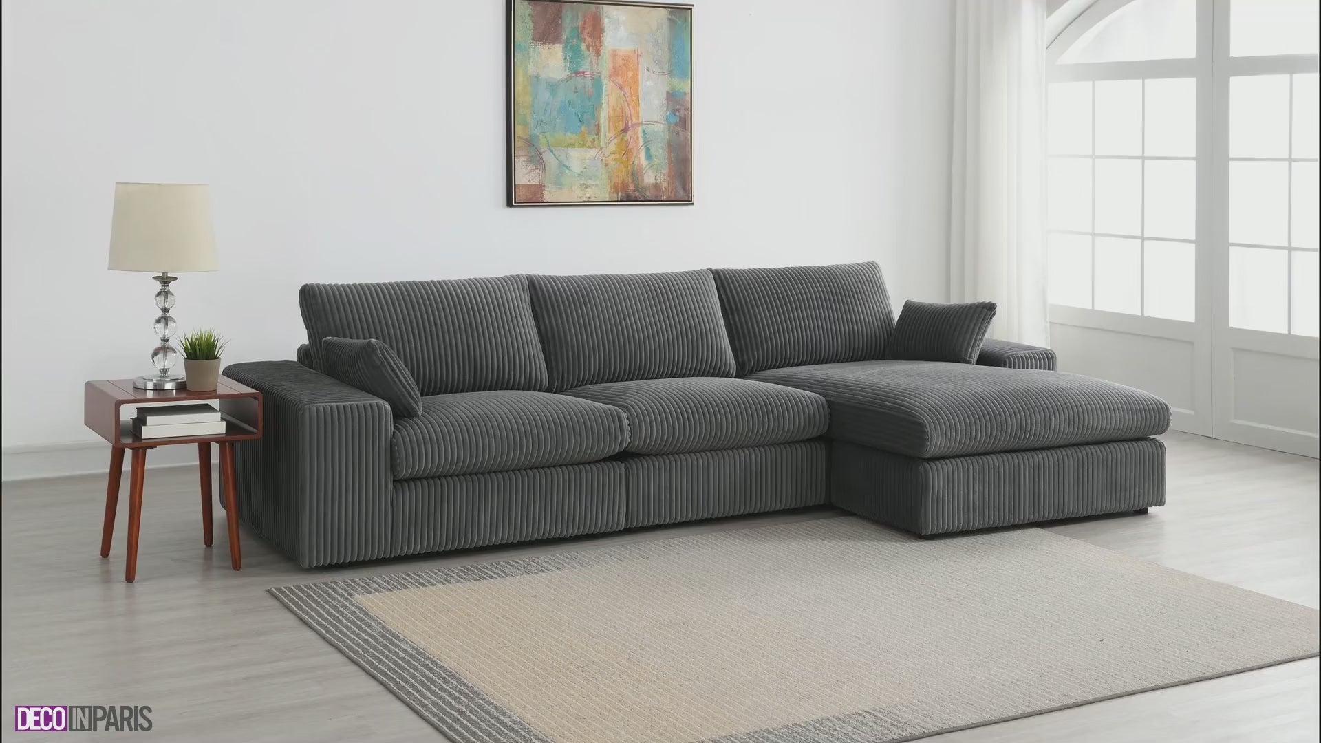 Découvrez le canapé d'angle réversible SIRINA en gros côtelé doux gris, idéal pour apporter une touche de modernité et d'élégance à votre salon. Son esthétique raffinée et son revêtement en velours côtelé s'intègrent harmonieusement à tous les styles d'intérieur, qu'ils soient design, classiques ou contemporains.