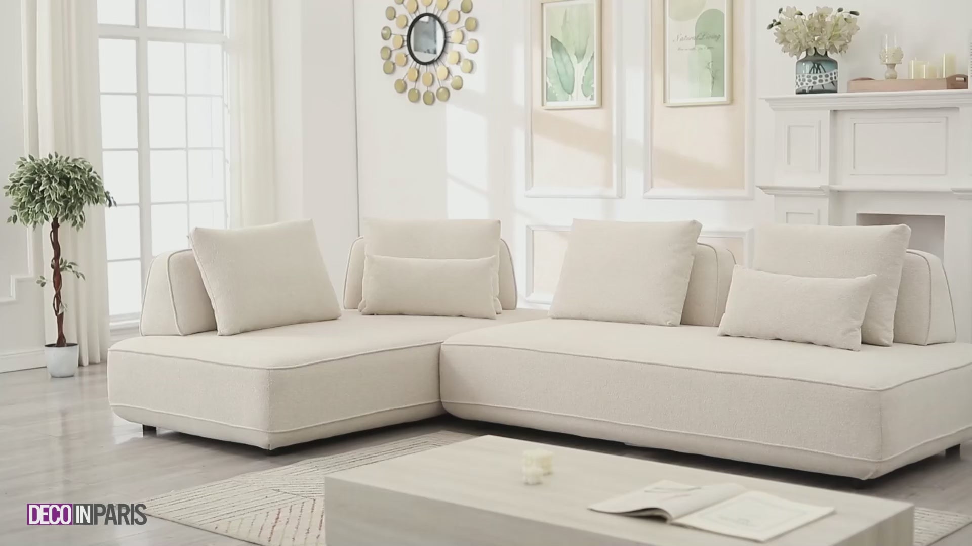 Apportez un souffle de douceur et d’élégance à votre salon avec le canapé d'angle réversible en tissu bouclette beige ISAORA.