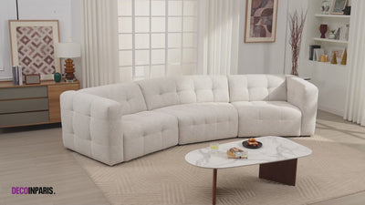 Avec le canapé droit ARELIA en velours texturé beige, offrez à votre salon une parenthèse de douceur.