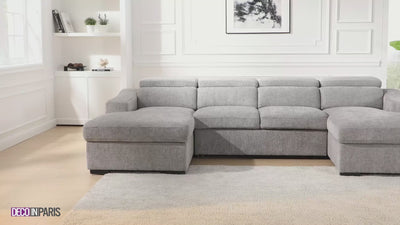 Découvrez l’élégance et la praticité réunies dans le canapé panoramique en U convertible avec coffre en velours chiné gris VELORA.