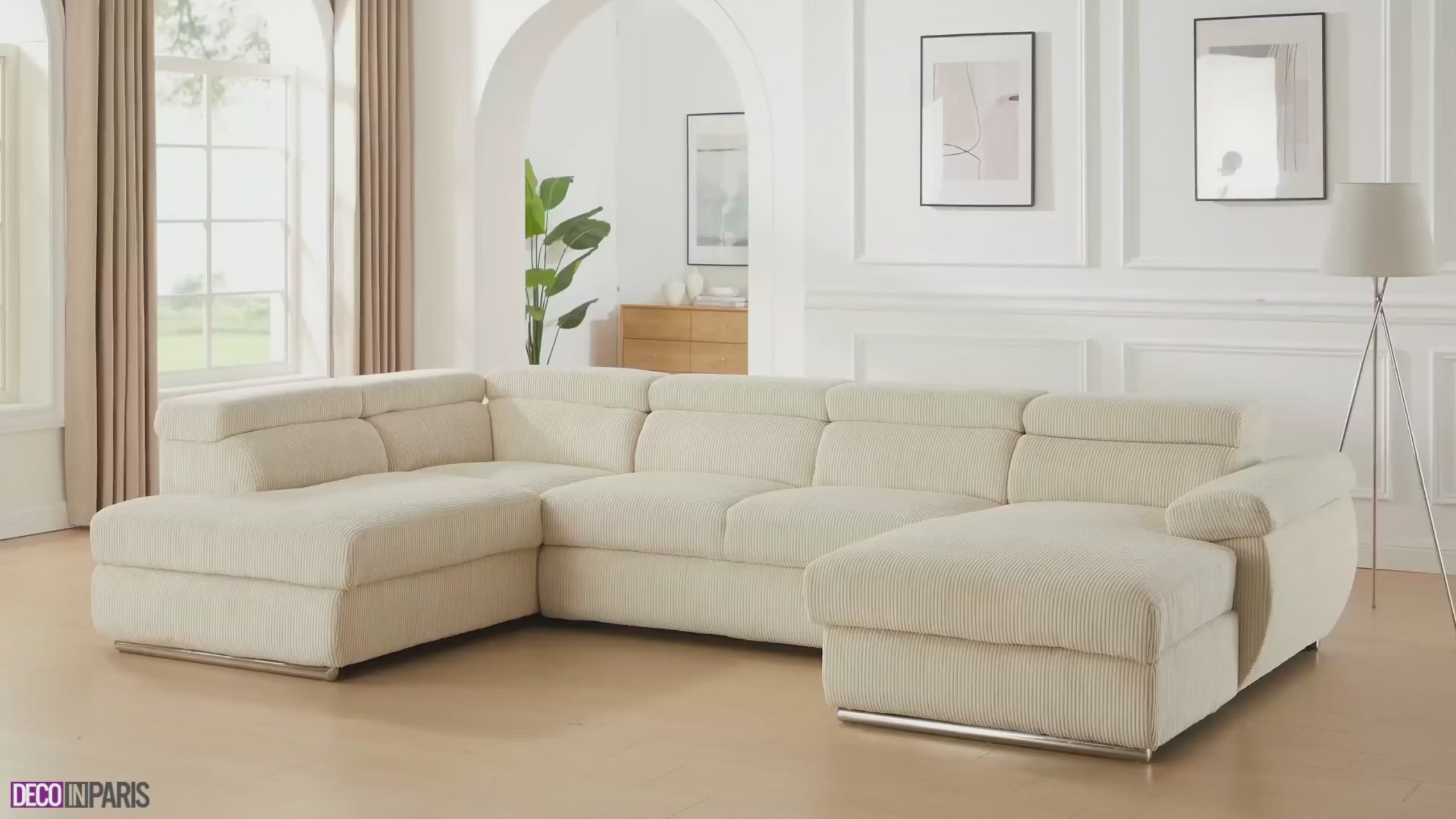 Transformez votre salon en un endroit chaleureux et confortable avec le canapé d’angle droit convertible avec coffre de rangement en velours côtelé épais beige MARIANO !