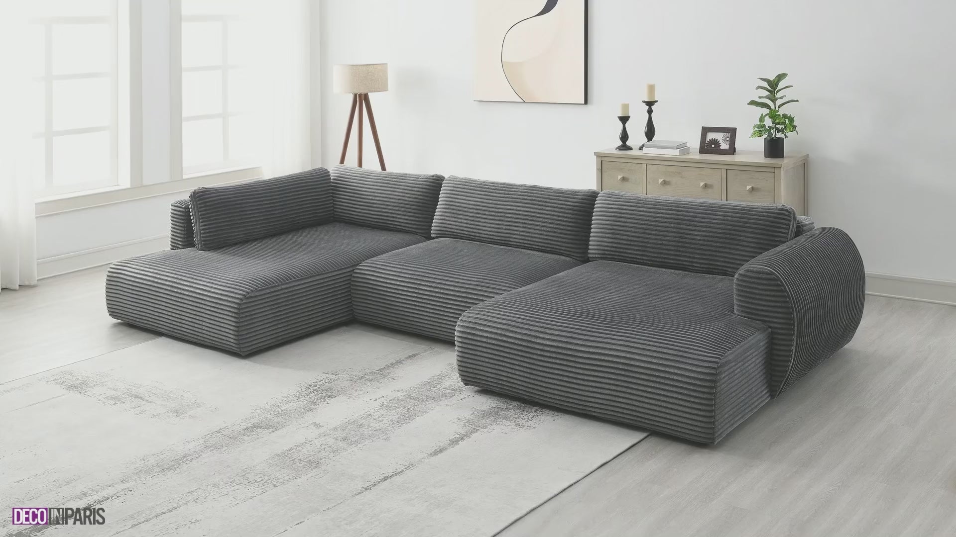 Le canapé panoramique convertible TILDA en velours gros côtelé gris est la solution parfaite pour créer un intérieur à la fois cosy et élégant, alliant confort, style et fonctionnalité.