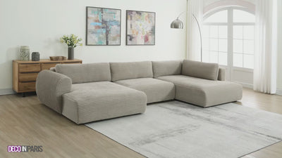 Canapé panoramique convertible avec coffre en velours gros côtelé taupe TILDA - Angle droit Prix de vente1.649,00 € Prix normal2.199,00 € - 25%
