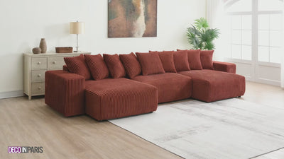 Canapé panoramique réversible convertible avec coffre en velours côtelé épais terracotta NOELIA