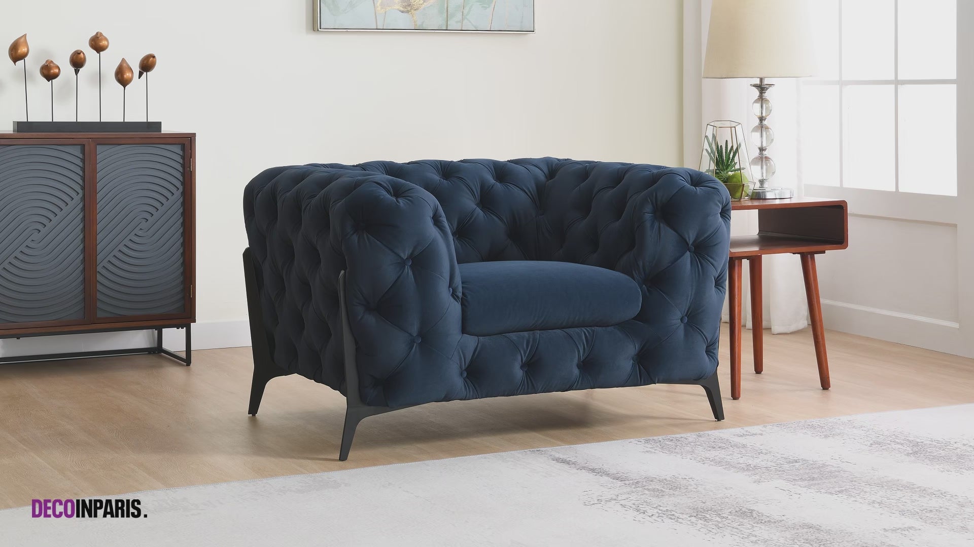 Découvrez l’alliage parfait du style mythique et indémodable du chersterfield avec la modernité du métal noir du fauteuil capitonné en velours bleu CARMEN.