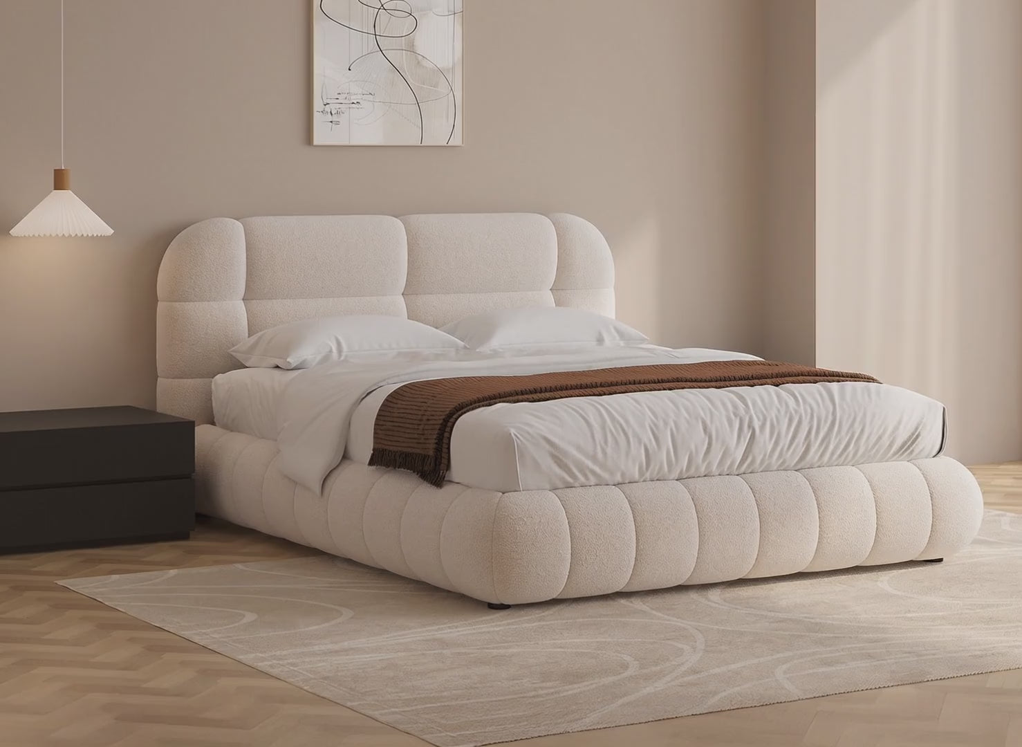 Rehaussez l’élégance de votre chambre avec notre lit coffre en tissu bouclette écru 160 x 200 cm YOURI !