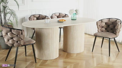 Accueillant jusqu'à 6 personnes, le design unique de la table DHARA est sublimé par ses pieds larges et ronds, conçus dans un style contemporain et épuré. Ces pieds robustes et harmonieux apportent à la fois stabilité et une touche artistique à l'ensemble, tout en renforçant l'esthétisme moderne de la pièce.