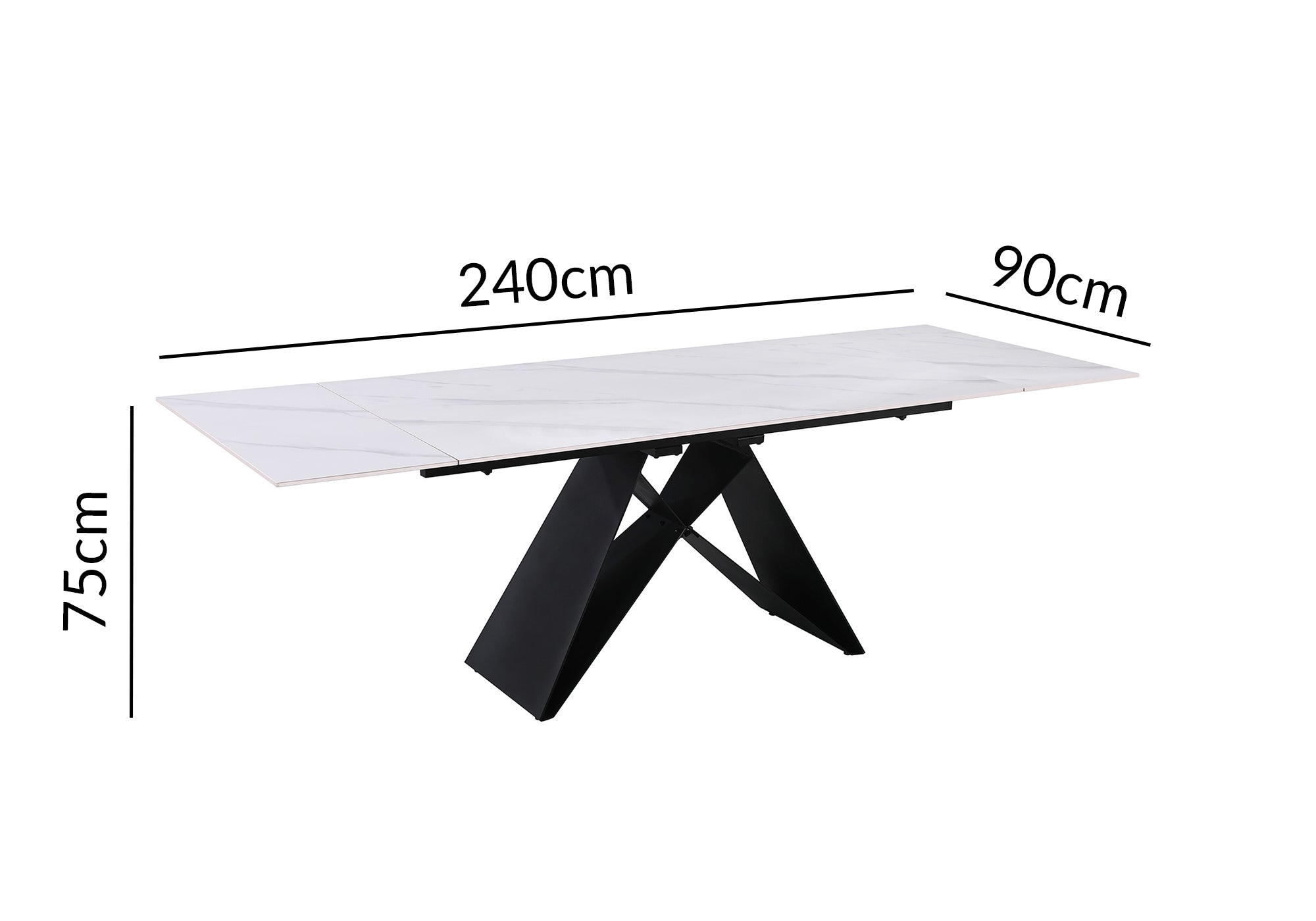 HELSINKI, la table à manger extensible qui mêle design moderne et praticité. Son plateau en céramique blanc marbré, s’associe à un piètement en métal noir.